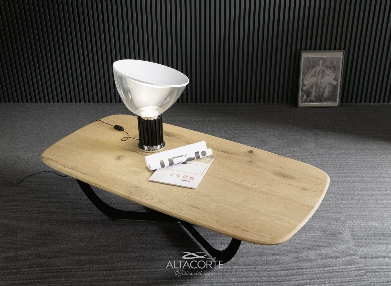 Piano in rovere massello sp. 30 superfice spazzolata. Basamento in acciaio verniciato a polveri. Collanti vinilici all’acqua, vernici acriliche bicomponenti.