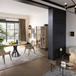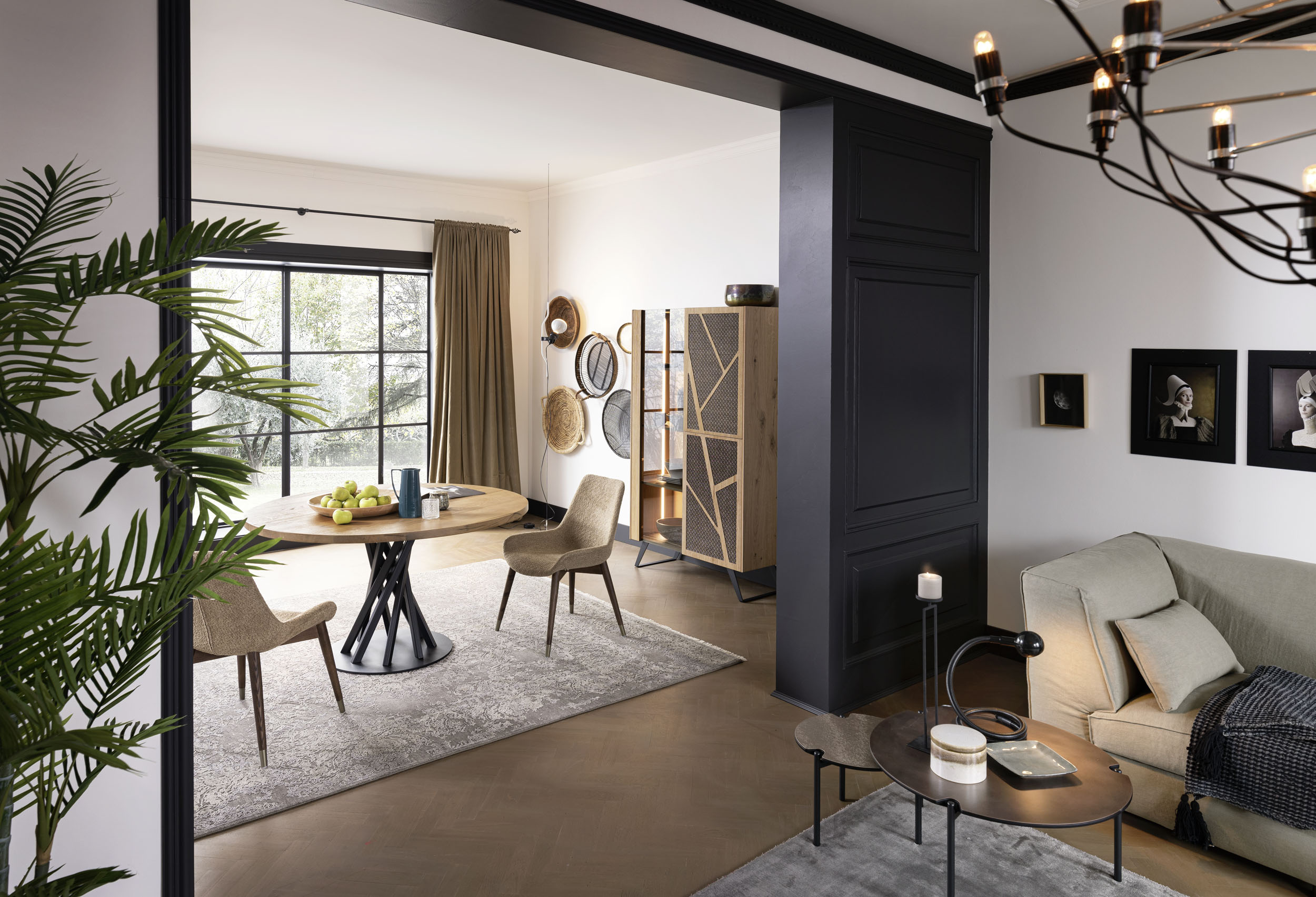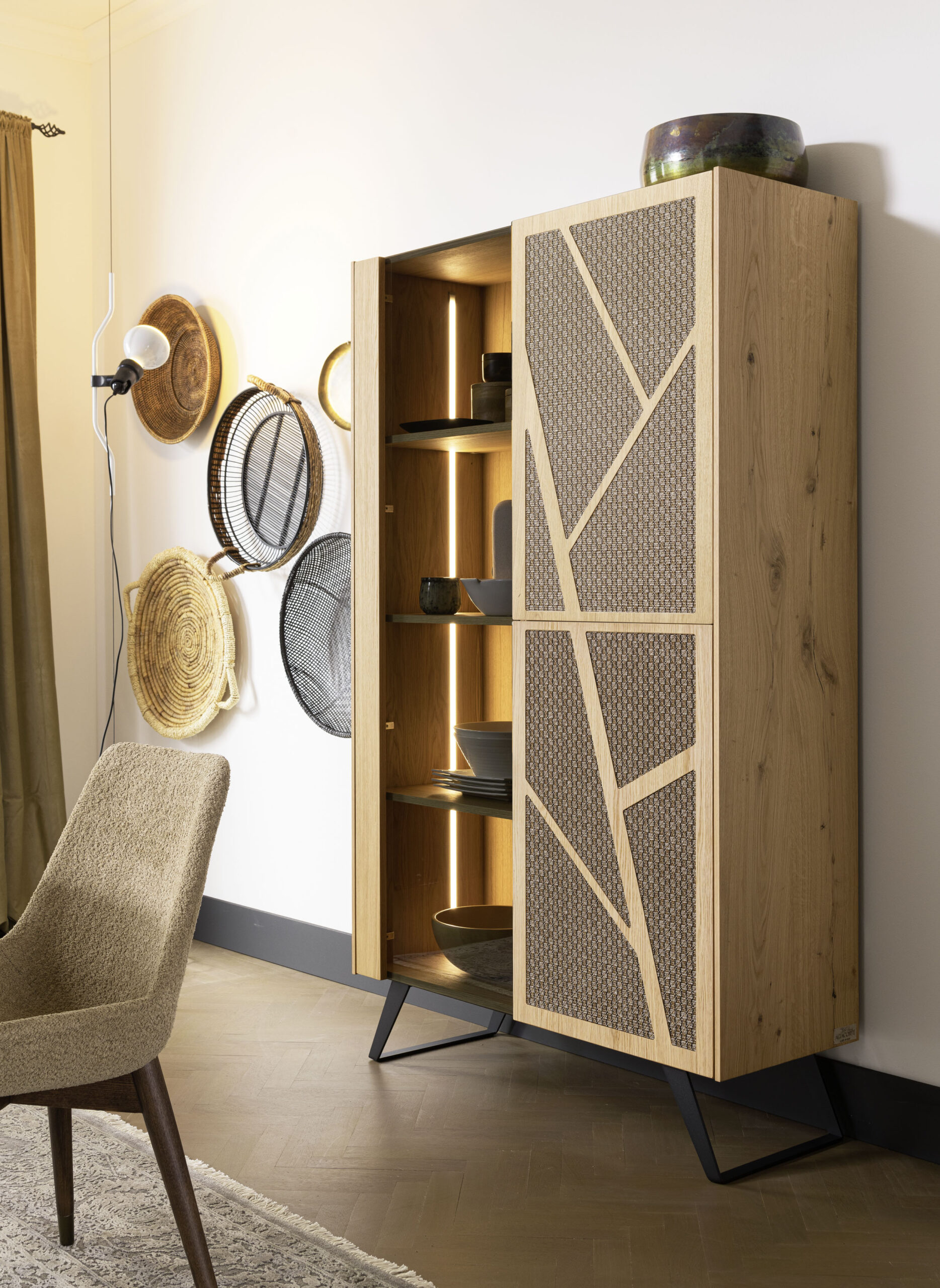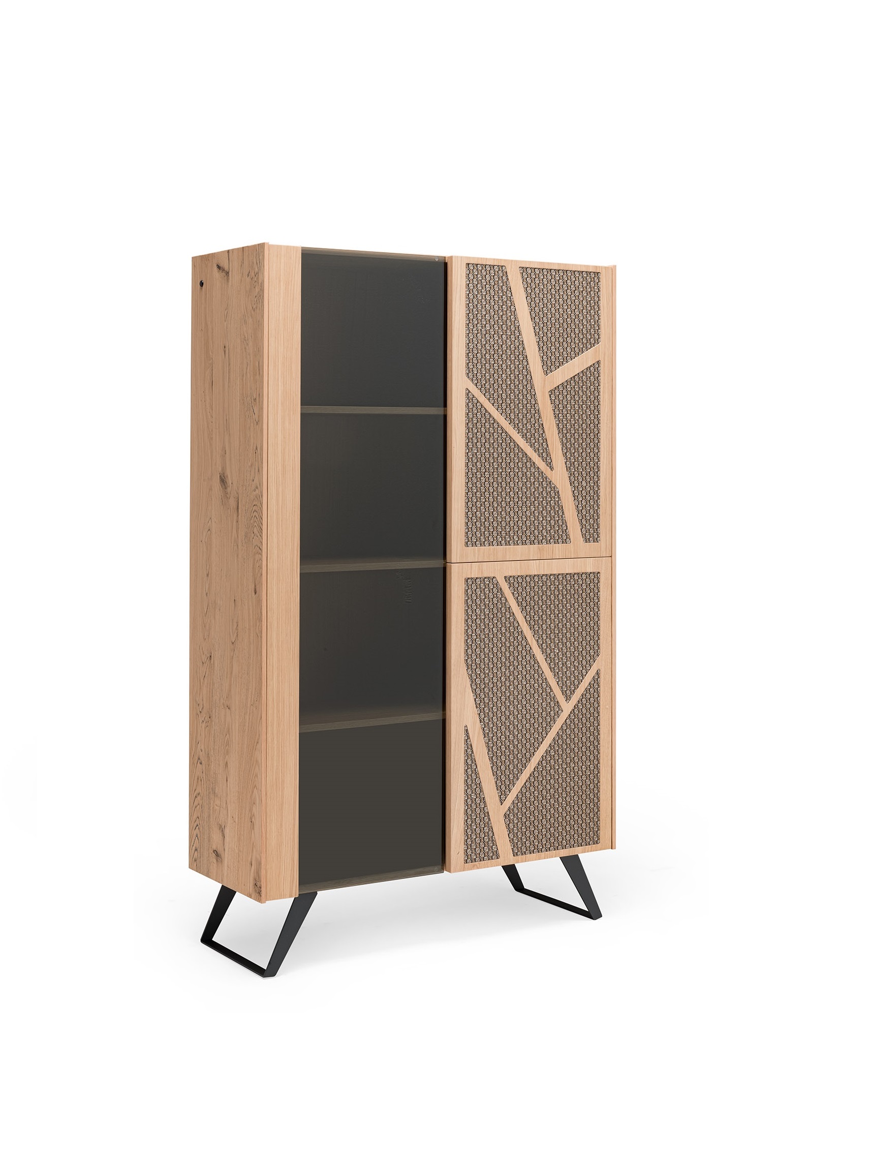 Scocca disponibile in due versioni: materico o legno di rovere. Due ante di rovere, la terza in vetro fumé temperato spessore 6 mm. Basamenti in acciaio verniciato a polveri o ossidato con finitura acrilica.
